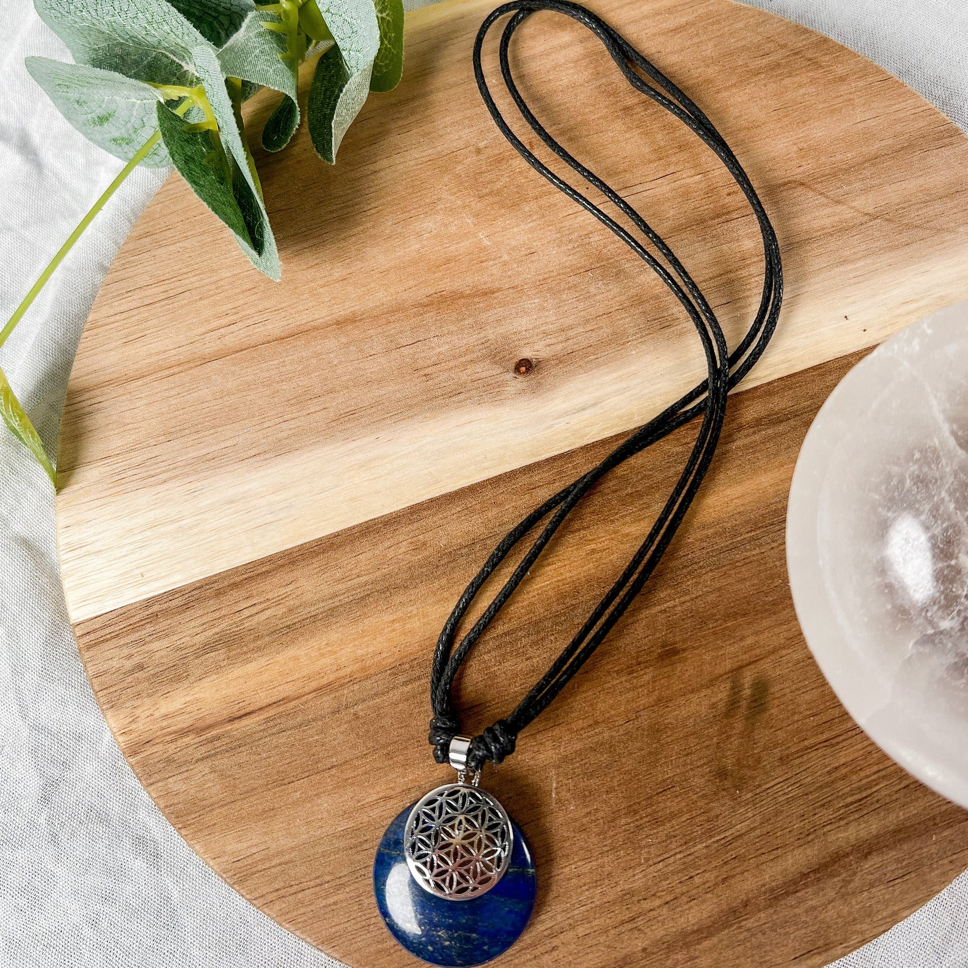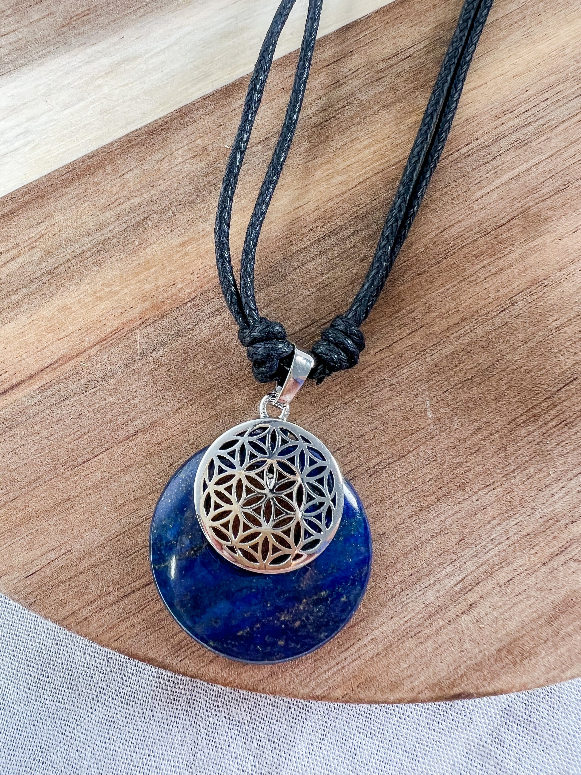 Embrace your spiritual side with this gorgeous Lapis Blue Necklace! Featuring an ornate Flower of Life symbol, this stunning piece will bring out your zen inner goddess! Make a statement and turn heads with this mystical accessory that's perfect for all kinds of occasions!
