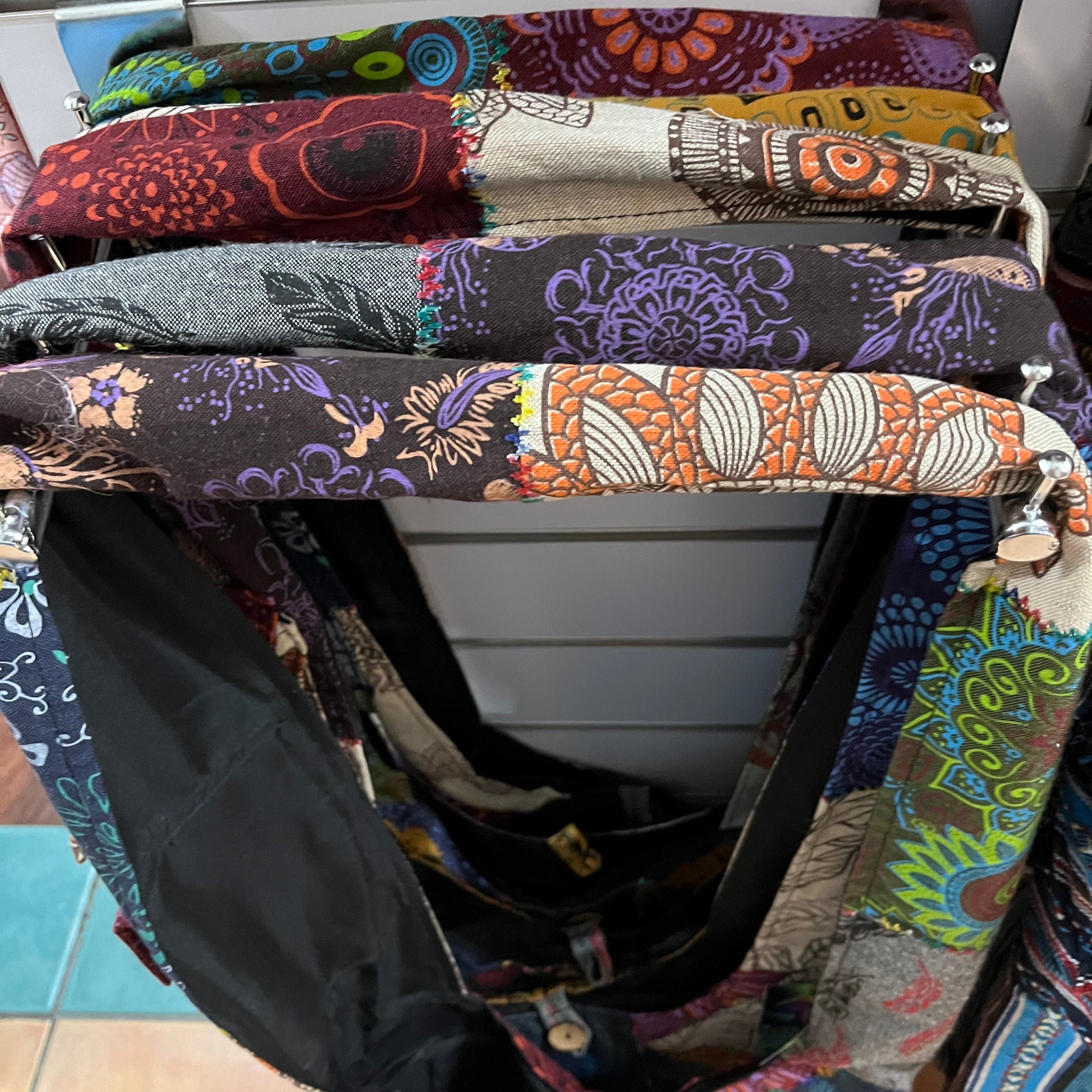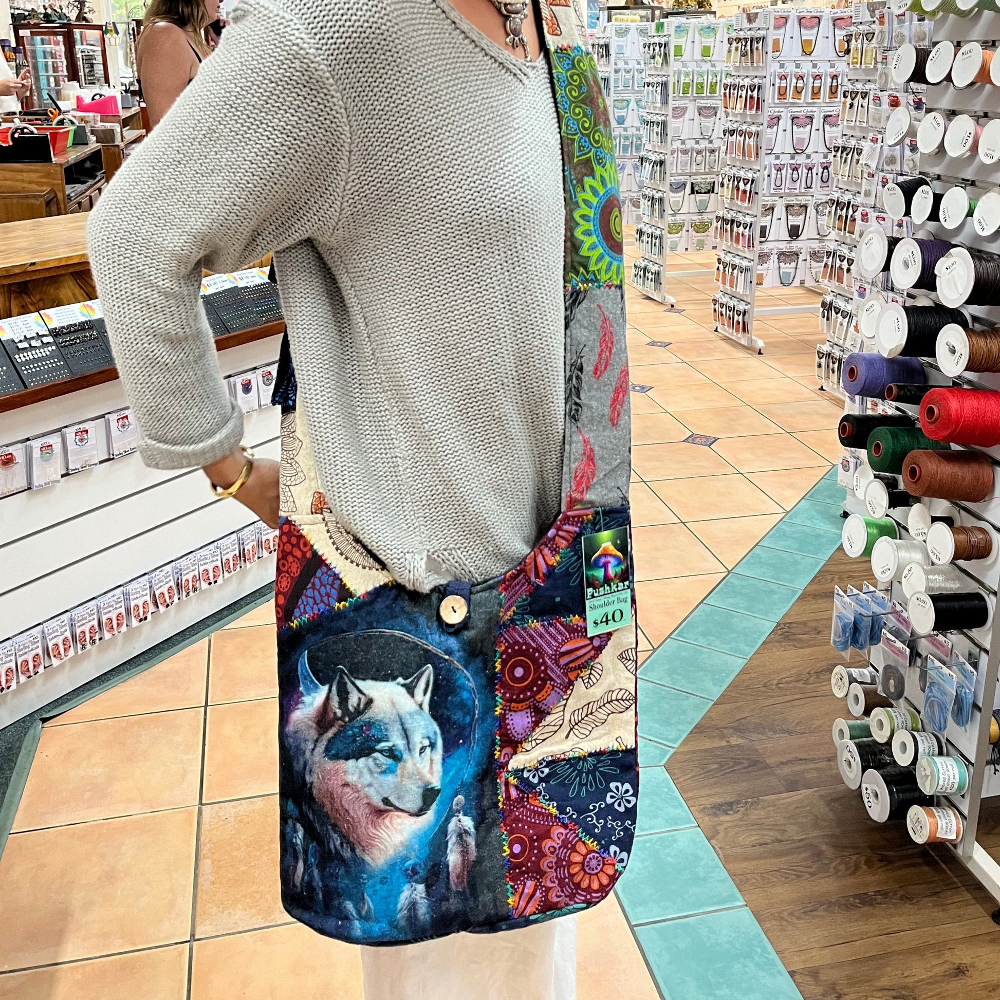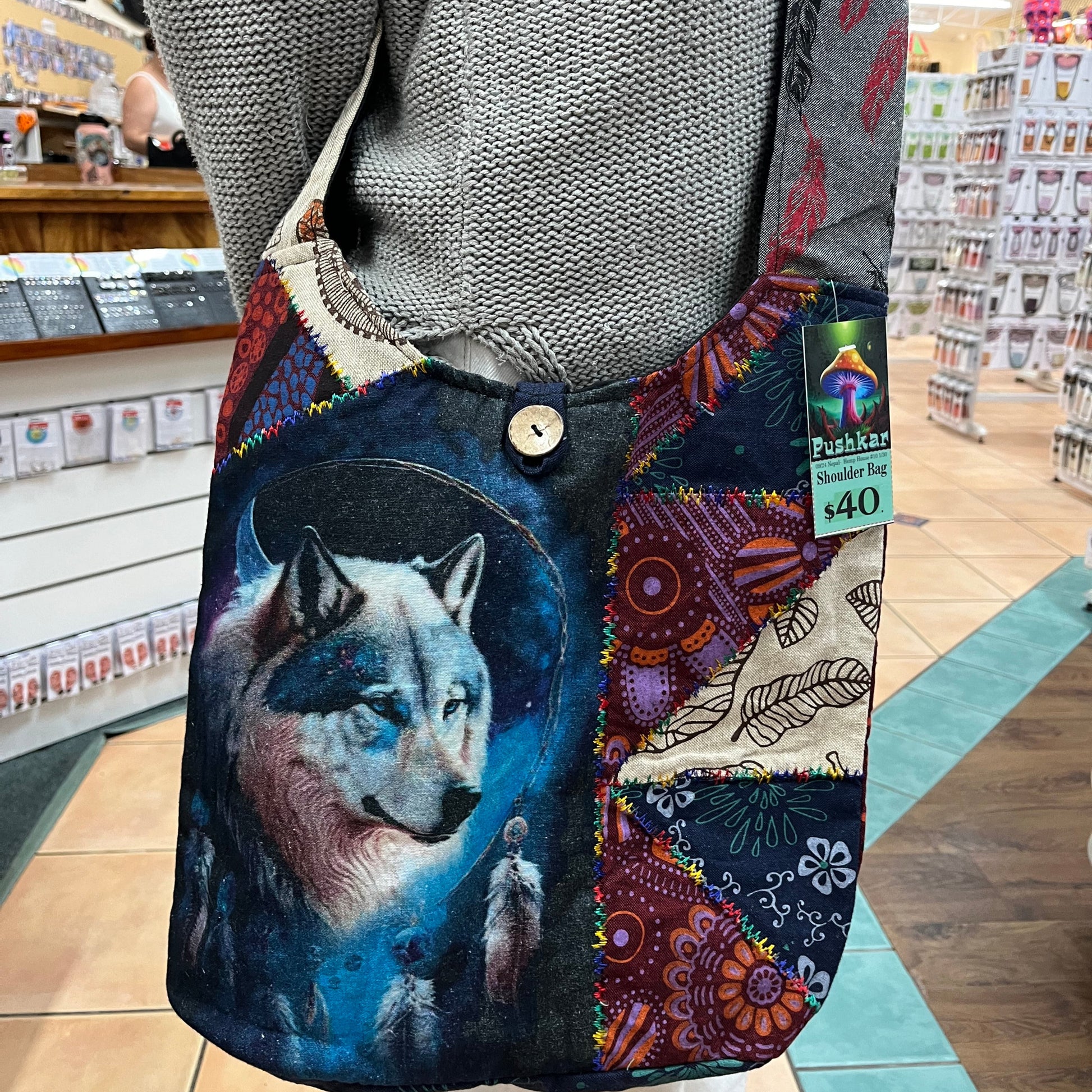 Wolf Patchwork Bag made in Nepal, each bag comes with a unique multicolored strap that may not match the one shown. Check the listing photos for examples- bags are chosen at random for each order!